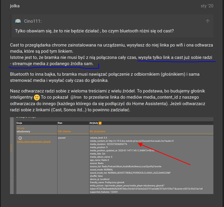 Chodzi m.in o ten cytat “Jeżeli odtwarzacz radzi sobie z linkami (Cast, Sonos itd…) to powinno zadziałać.”